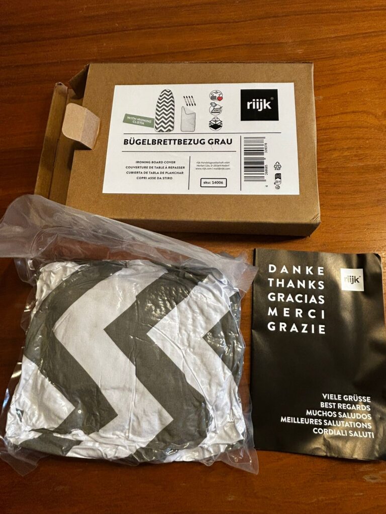 Der Bügelbrettbezug stammt von der Marke riijk, die sich auf praktische Haushaltswaren spezialisiert hat. Die Verpackung ist ein stabiler Karton in Naturbraun, der einen soliden Eindruck vermittelt. Auf der Vorderseite befindet sich ein informativer Aufkleber mit allen relevanten Details. Die Produktbezeichnung „Bügelbrettbezug Grau“ ist deutlich erkennbar. Zusätzlich sind auf dem Aufkleber Symbole abgebildet, die die wichtigsten Eigenschaften darstellen. Neben der Produktabbildung wird auf Material und Nutzung hingewiesen. Mehrsprachige Bezeichnungen ermöglichen die internationale Vermarktung des Produkts. Auf der Rückseite finden sich Hinweise zu Größe und Anwendung. Das Design der Verpackung ist funktional und sachlich gehalten. Im Inneren ist der Bezug hygienisch in Kunststofffolie eingeschweißt. Diese Folie schützt das Textil vor Staub und Feuchtigkeit. Zum Lieferumfang gehört außerdem ein kleines Booklet. Darin bedankt sich der Hersteller in mehreren Sprachen beim Kunden. Diese Beilage trägt zu einem positiven Eindruck bei. Die Verpackung ist platzsparend gestaltet und erleichtert den Versand. Die Entnahme des Bezugs aus der Umverpackung erfolgt unkompliziert. Auch die Spannclips sind separat und geschützt verpackt. Alle Bestandteile wirken ordentlich angeordnet. Die Verpackung ist insgesamt übersichtlich und vermittelt Professionalität. Schon beim Auspacken wird deutlich, dass es sich um ein durchdachtes Produkt handelt.