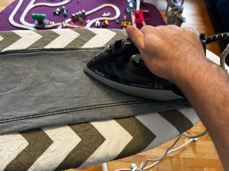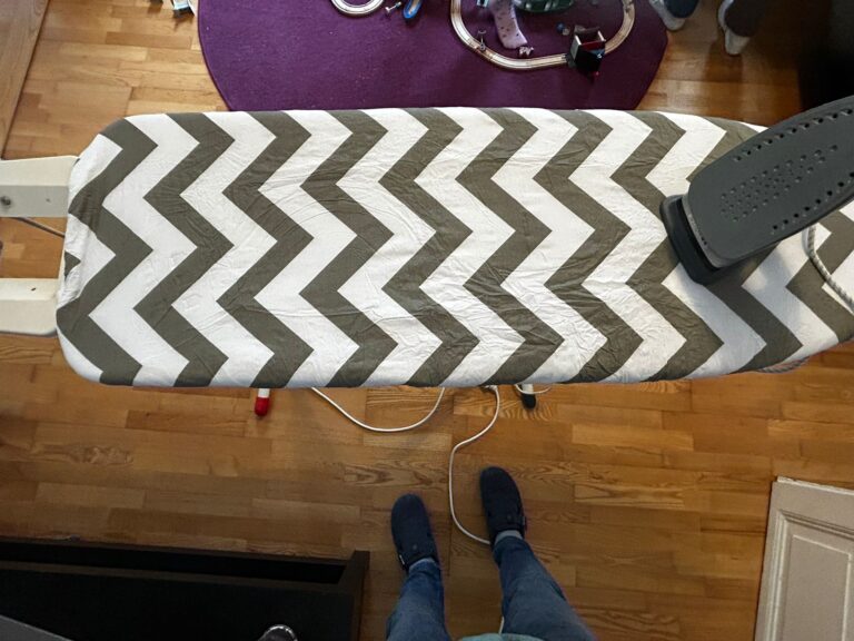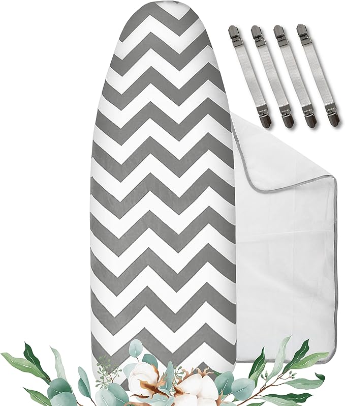 Der Bezug besteht aus einer Kombination von Baumwolle und Polsterung. Die Baumwolloberfläche ist in einem grau-weißen Zickzack-Muster gestaltet. Dieses Design wirkt modern und passt in viele Haushalte. Die Polsterung ist mehrschichtig aufgebaut, um ein gleichmäßiges Bügelergebnis zu erzielen. Der Stoff fühlt sich robust und gleichzeitig weich an. Durch den mehrlagigen Aufbau wird die Hitze des Bügeleisens gleichmäßig reflektiert. Dadurch glätten sich Textilien schneller und effizienter. Im Lieferumfang enthalten sind mehrere Spannclips aus Metall. Diese Clips halten den Bezug sicher am Brett fest. Der Bezug verfügt über einen elastischen Gummizug, der umlaufend eingearbeitet ist. Dadurch lässt er sich leicht überziehen und festziehen. Das Material ist hitzebeständig und für Dampfbügeleisen geeignet. Der Stoff ist dampfdurchlässig und verhindert Feuchtigkeitsstau. Gleichzeitig sorgt die Polsterung für Komfort beim Bügeln. Die Verarbeitung wirkt hochwertig und langlebig. Nähte und Kanten sind sauber verarbeitet. Der Bezug ist für verschiedene Brettgrößen geeignet. Das Zickzack-Muster sorgt für eine optische Aufwertung des Bügelbretts. Insgesamt vermittelt das Material einen soliden und alltagstauglichen Eindruck.